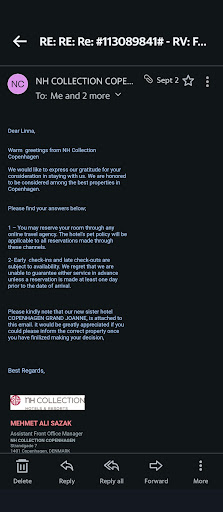 This hotel fails at every level: service, communication, and basic decency. I strongly urge NH Hotel Copenhagen to retrain its front desk staff, especially those in managerial roles, on how to treat paying guests with respect and...