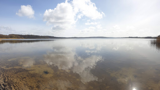 Fint natursted med en åben sandstrand i nordenden af Tystrup sø. Flere ildsteder med jern-grill i græsset ved stranden.