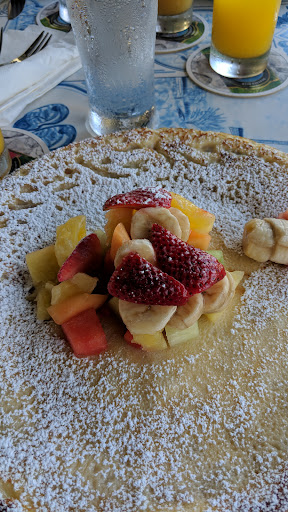 I had the Aruba pancake (15.50 US). It had a shot glass of poncha cream (basically egg nog with rum in a 1:2 ratio) with a large serving of full fat whipped cream. Suspecting this alone would not be enough, I also ordered a side of fruit (6.50 US). I also had a glass of freshly squeezed orange juice (5.50 US) as well: it was what advertised.