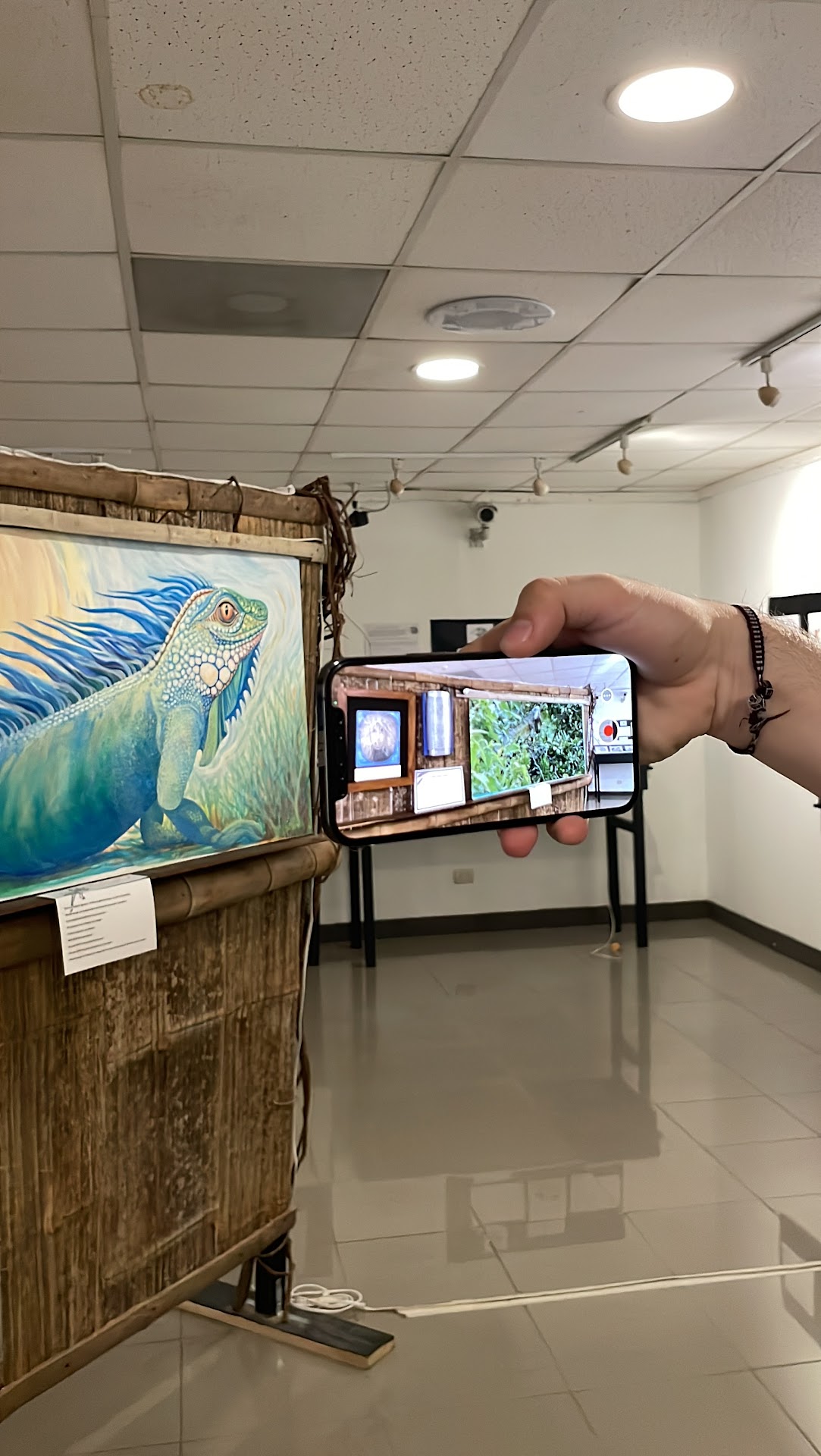 En la primera exposición se puede apreciar la fauna que existe en Manabí por medio de la realidad aumentada. Primero hay que descargar una aplicación que el guía indica. Por medio de ésta app se enfocan los dibujos y lienzos que están expuestos y empieza a reproducirse unos vídeos de los animalitos en su hábitat natural 🦆🦎🦋