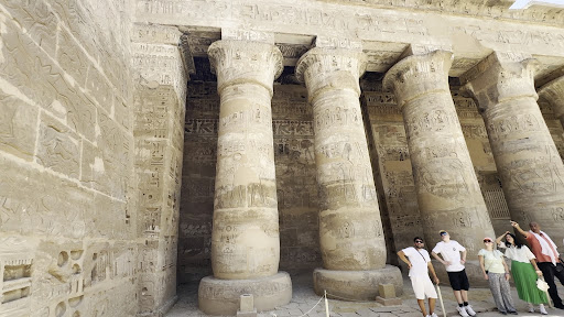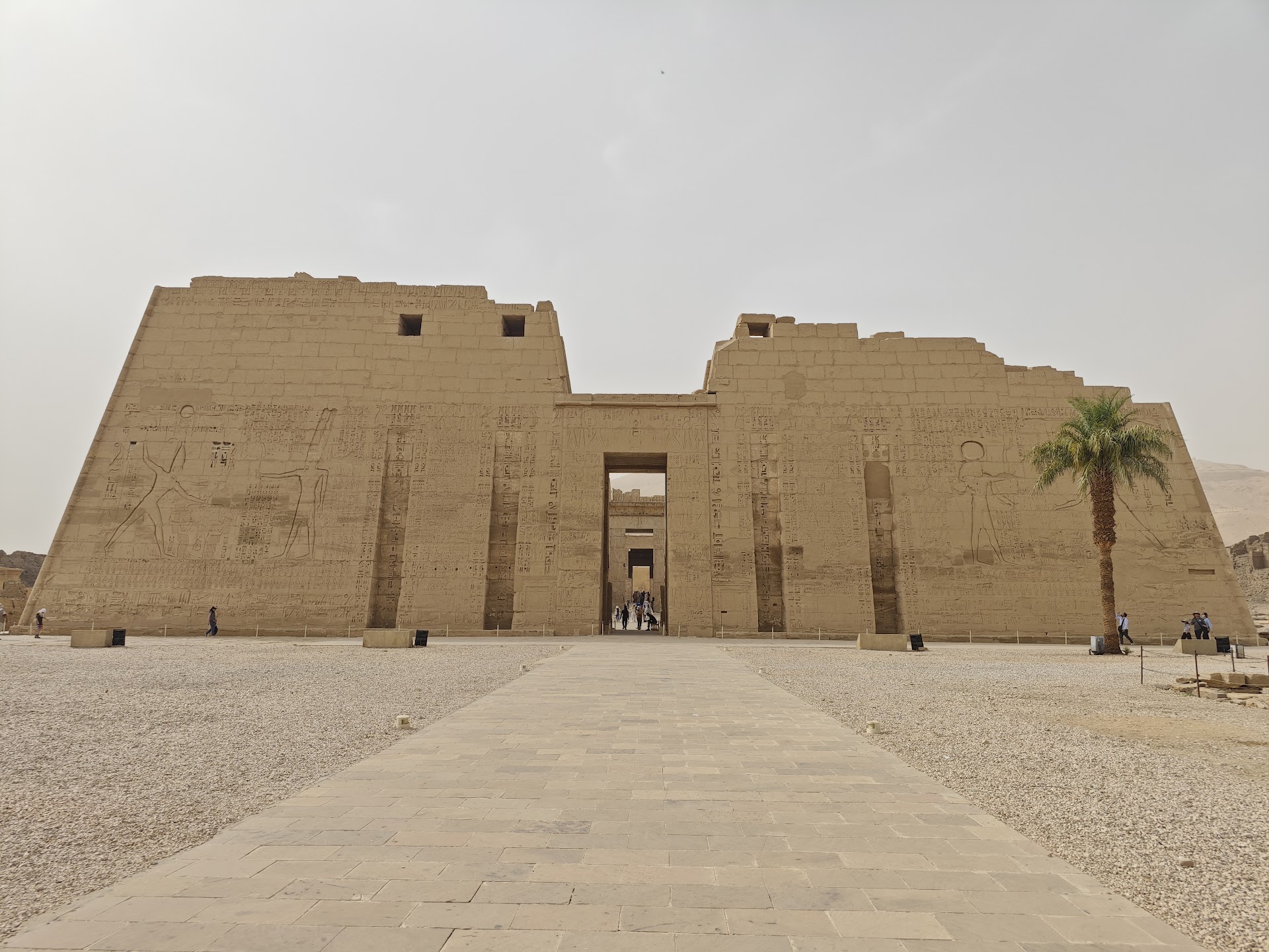 Architectural Highlights The temple complex spans ~150 meters and features: First Pylon: Massive entrance adorned with reliefs of Ramesses III’s military triumphs, including battles against the Sea Peoples . Great Courtyards: Open spaces lined with Osiride statues of Ramesses III and columns depicting religious rituals . Hypostyle Hall: A columned hall with vibrant, well-preserved carvings of religious texts and royal decrees . Royal Palace: A residential area within the complex, blending practicality and grandeur . Migdol Gate: A fortified entrance resembling an Asiatic fortress, unique in Egyptian architecture . Temple of Amun: An older 18th Dynasty shrine built by Hatshepsut and Thutmose III, later incorporated into the complex .