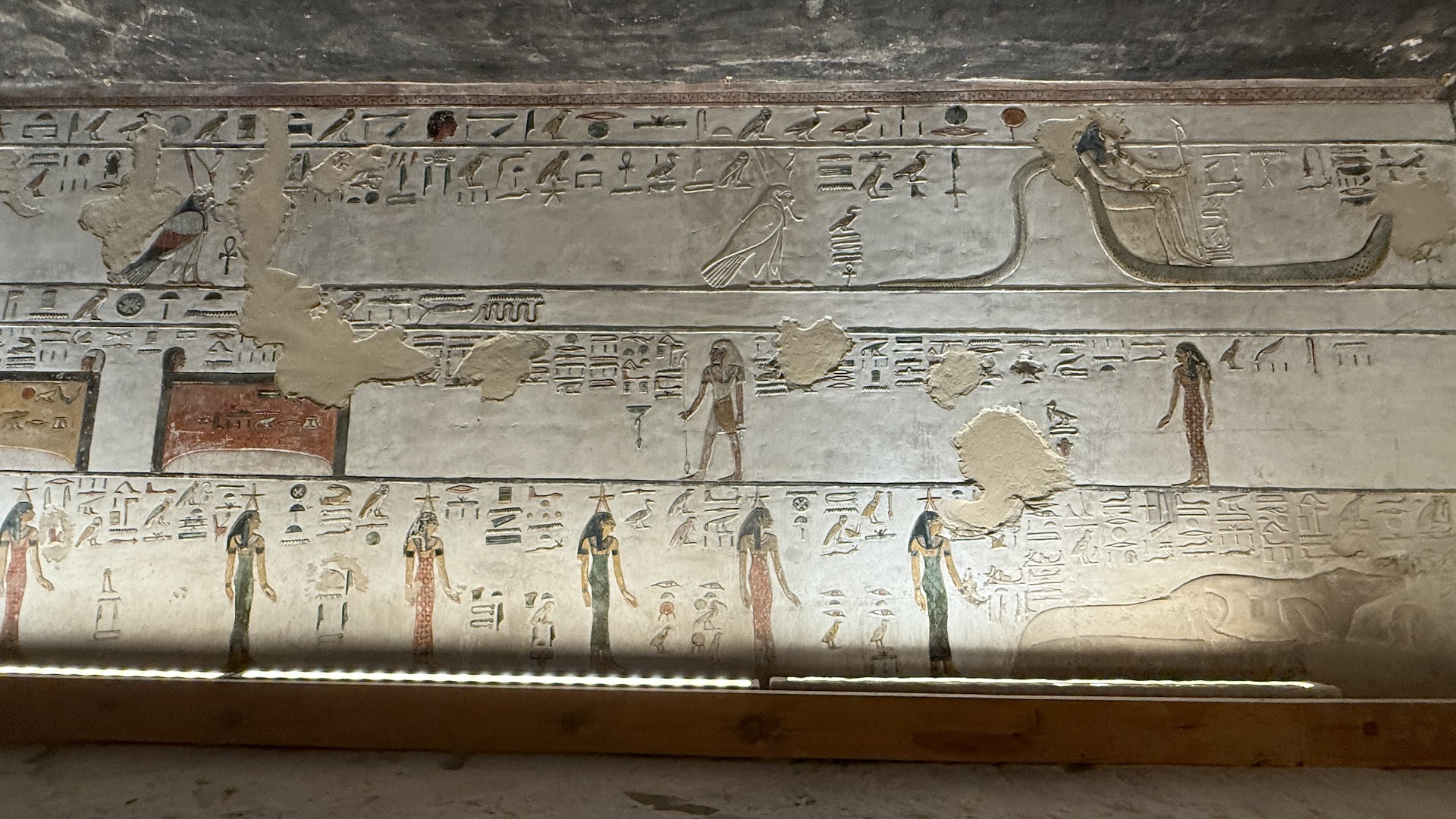The walls and ceilings are covered with deeply carved and vividly preserved scenes of funerary texts and rituals—featuring the Opening of the Mouth, Book of Gates, Book of the Dead, Amduat, Litany of Re, and Book of the Heavenly Cow . One highlight is a side chamber with unfinished stencil sketches, offering a rare glimpse into the ancient artists’ process: first rough outlines in red, detailed lines in black, and then color applied atop—an exceptional educational feature .