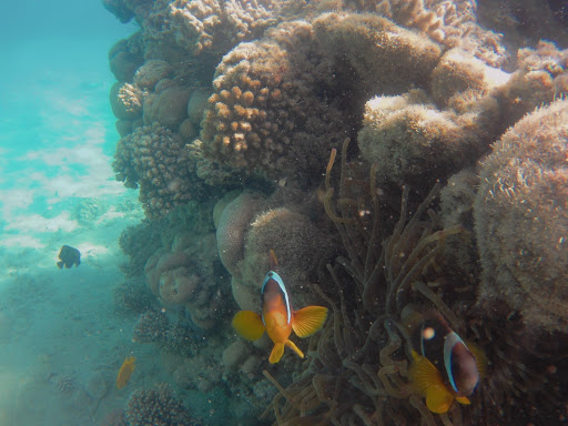 If you are going to or currently are at Makadi Bay, and you are a bit disappointed with the corals / sealife, what you need to know is there actually is a reef that is still alive, but you do need to go a fair bit to reach it. If you start from eg the beach at Lemon & Soul / Labranda, most people stick to swimming the direct surroundings, and you do already see some fish, but to get to the good part what you need to do is pass by the point where the water gets dark blue. You cant reach it by swimming directly, because the water will be too undeep / you would have to step on corals to get to the good bit so please dont do that because you will destroy nature.
