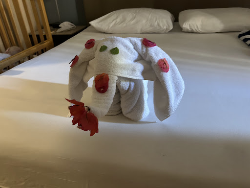 We stayed for 5 nights and had a good time overall. We arrived very late at night/early hours of the morning and they opened the restaurant especially to give us some food and drinks after a long travel day which was appreciated as no hotel has done this for us in the past. I requested a ground floor room as I cannot manage steps due to a surgery I had recently, the hotel kindly accommodated this without issue and went the extra mile an gave us a room close to the amenities and reception so I didn’t need to walk too far. The rooms are very dark and only have 1 plug socket however (take an extension lead), beds are very uncomfortable like a slab of concrete and the pillow like a bag of rocks. That would be my only down side on the rooms. Air con is really good and not capped or chargeable like in a lot of hotels, beach towels are provided in advance in the room at no cost and the cleaning team are friendly always saying hello and asking if you need water etc. they did cute fun things with the towels as well making swans, elephants, hearts and I really liked this nice touch.