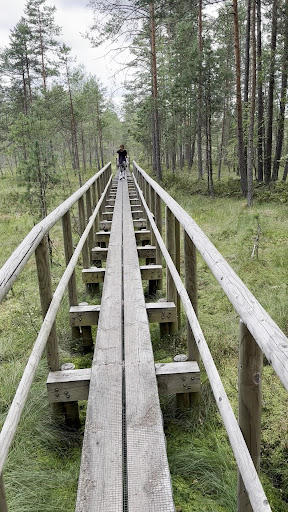 There’s a spacious picnic area with a grill and toilet near the lake. From there, you can choose between the bog trail or the hill trail. We chose the bog trail - it’s beautiful and easy to walk. There are some parts with steep uphills and downhills, but also classic bog sections and areas where the path is made of tree roots.