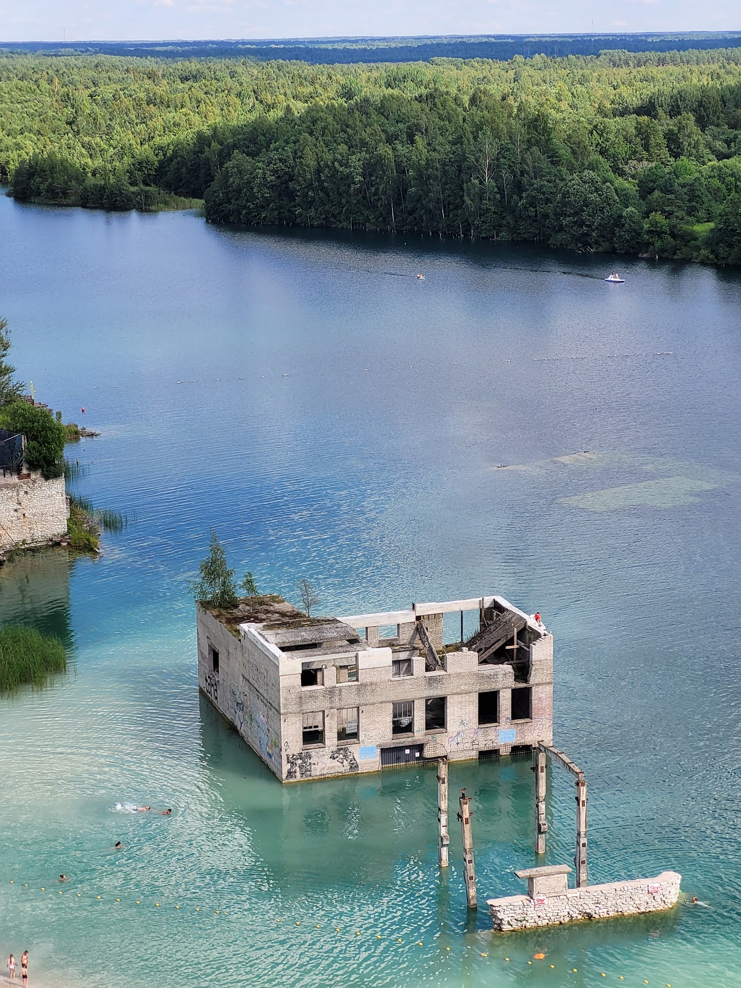 The place itself might be interesting indeed - a pretty blueish lake, a tall cliff overlooking the place and a few empty abandoned soviet brick buildings could give a picturesque view that resembles an ‘abandoned beauty in nature’ kind of vibe, but even this mere resemblance is ruined by the rubberoid water-slide-playing-ground thing in the water.