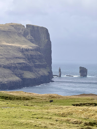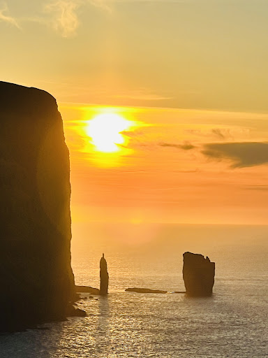 Read moreUnas vistas del atardecer espectaculares, desde este mirador al norte de Eysturoy, uno de los más memorables de las islas. Desde aquí se contemplan con claridad las formaciones rocosas conocidas como Risin og Kellingin, que en feroés significan “el gigante y la bruja”. Según la leyenda, fueron dos gigantes enviados desde Islandia para robar las Islas Feroe, pero al no lograrlo antes del amanecer, quedaron petrificados para siempre mirando al mar. Risin (el gigante) mide unos 71 metros de alto y se encuentra más alejado de la costa; mientras que Kellingin (la bruja), de 68 metros, está más cerca del acantilado, separada solo por un estrecho canal. El acantilado junto a Risin og Kellingin, alcanza una altura aproximada de 300 a 343 metros sobre el nivel del mar. Esta pared escarpada forma parte de los grandes farallones volcánicos de la isla, característicos por su verticalidad. La vista desde este punto permite observar el Atlántico Norte, el perfil de la isla de Streymoy, y en días despejados incluso parte del relieve montañoso de Eysturoy. Además, es una buena zona para ver aves marinas volando entre los acantilados, como fulmares y alcatraces. El mirador está bien señalizado y se accede fácilmente en coche. Recomendable llevar ropa de abrigo, ya que el viento suele soplar fuerte, especialmente al atardecer. Un lugar cargado de misticismo, leyenda y...