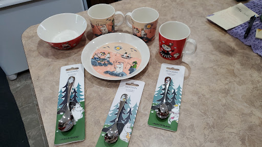 Shopping for beautiful glassware that is handmade. The people working were helpful and friendly. Special priced sales as well as regular sales went out the door with me on today's visit. They carry the ever so popular Moomin characters on several items like cups, bowls, plates, and silverware. They're so cute, and after hearing about the Moomin story I was hooked. Check out my pics of my collection. I also bought some Moomin gifts for little...