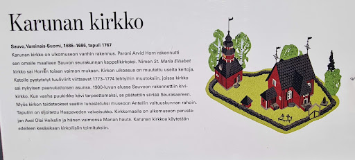 Read moreKaunis vanha puukirkko rakennettu 1685-1686 ja kellotapuli 1767. Karunan kirkko on ulkomuseon vanhinrakennus. Kirkkoon pääsee sisälle ulkomuseon aukioloaikoina, museon pääsylipulla. Ovella oli opas joka osasi kertoa kirkon historiasta lisää. Historian havinan voi aistia parhaiten käymällä sisällä, istumassa itse...