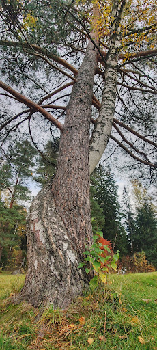 Tämä puukaksikko kannattaa bongata. Kaksi erilaista, kaksi vahvaa, kaksi juurevaa luonnon sielua keskellä avointa niittyä. Pelottomat. Elävät kietoutuneita toisiinsa. Itsenäisinä, silti yhdessä, vahvoina. Ainutlaatuinen kaksikko kasvaa yhdessä ja tukee toisiaan myrskyissä, nauttii ja nojaa toisiinsa kesätuulen syleilyssä. Tämä Parisuhdemalli on meille kaikille heikoille egojen riivaamille ihmisille. Puutkin osaavat yhdessä elämisen ...