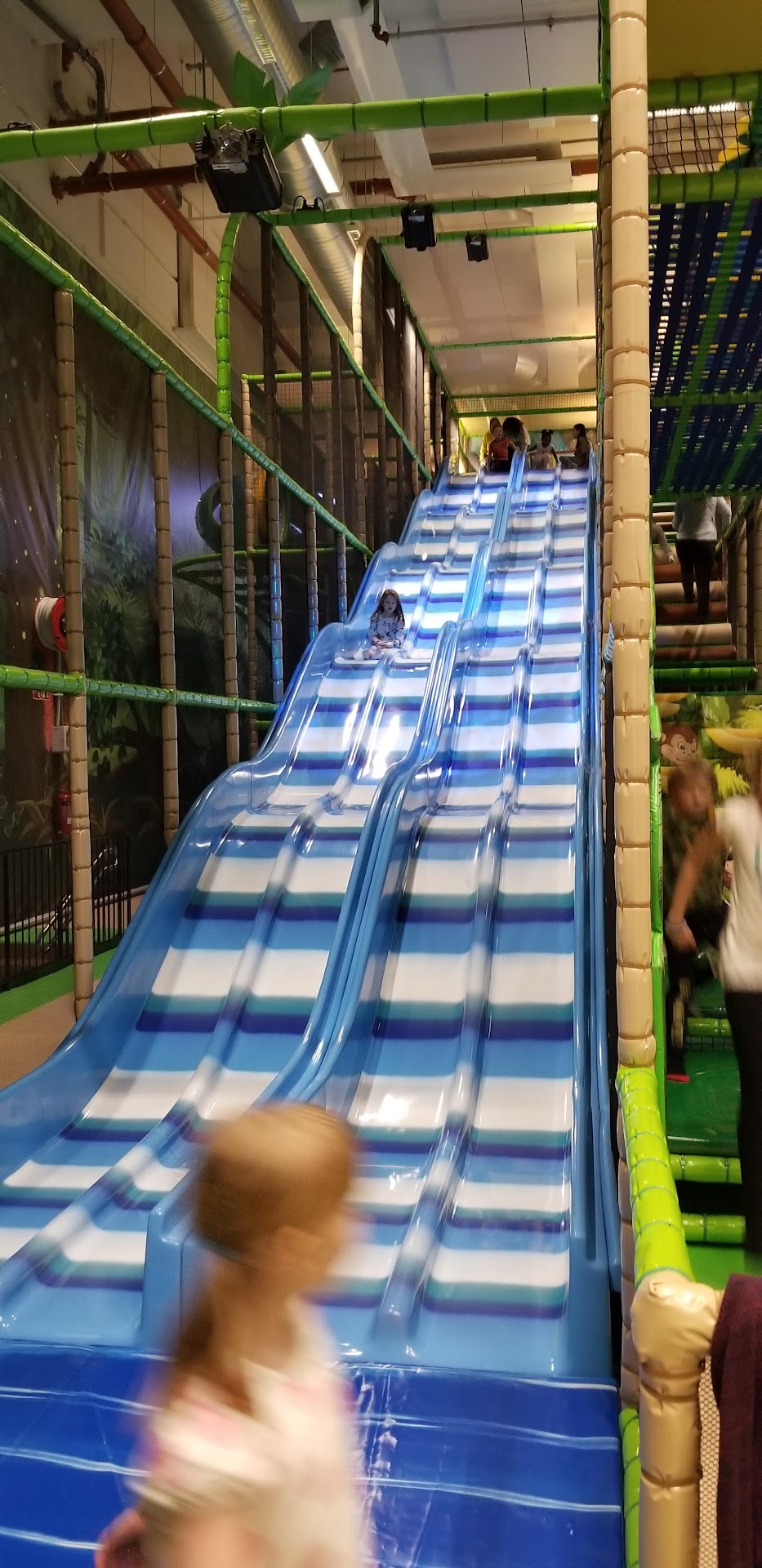 The area is quite large and the main area is several stories tall (approximately 10 meters) and has climbing areas, slides with and without tubes, jumping areas and mazes. Additionally there are areas and games that require additional payment in the form of tokens. As you can imagine the children are drawn to these attractions like moths to the flame and you can easily spend another 10-20 Euros per child if you are not careful.