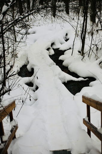 Delicate snow blankets the ground, coating wooden footbridges and overhanging branches, adding to the picturesque charm of this location.