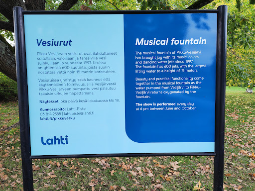Read moreLahden keskustasta kävelymatkan päässä oleva vehreä puisto jossa pieni järvi ja kestustasta tullessa heti tanssivat vedet suihkulähde jossa tiettyinä aikoina vesi suihkuaa musiikin tahtiin. Puistossa järjestetään erilaisia tapahtumia ja siellä viihdytään picnikillä. Kesäisin on myös pieni kioski kahvila puistoalueella jonka läheisyydessä myös katsomo ja katoksellinen esiintymislava jossa välillä myös ilmaisia musiikkiesiintymisiä. Sotilasmusiikkikoulun esiintyessä on heillä iso lava puistoalueella. Toisella puolella pientä järveä on kuntoilulaitteita ja kesäisin on saanut kokeilla vaikka sub lautoja. Pienestä vesijärven puistosta pääsee myös Lanu puistoon jossa patsaita. Pienen vesijärven kautta pääsee myös Vesijärven rantaan jossa monenlaista palvelua. Kahviloita, ravintoloita ja mahdollisuus risteilyille. Myös Sibeliustalolle voi kulkea puiston läpi ja rannan kautta jos tulee kävellen tai pyörällä. Muutenkin hienot ulkoilu lenkkeily mahdollisuudet pitkälle vaikka Mukkulan kartanolle asti tai toiseen suuntaan...