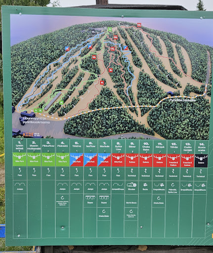 My favourite slopes are in the middle, where the non running T-bar is, so that reason I get kind of confused? There also good pillow lines in this area, but the lift won't help you. Usually time is spent on "Takarinteet" area, where the moguls run is and there even Freeride area with gladed woods with man made features. Very nice.