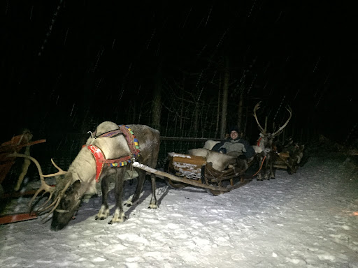 Our first encounter was kinda funny because I arrived late at night in the forest so was looking for a place to pitch my tent because I knew the village was nearby somewhere... Next morning I wake up because I hear bells... Not thinking much of it I get ready to go outside and I start washing myself with snow... All a sudden I hear those bells again and there a few Reindeer's pull a sledge behind them... And the driver and their two guests look at me... I guess it must have been looking rather odd... Me camping out there under a tarp washing myself with snow...