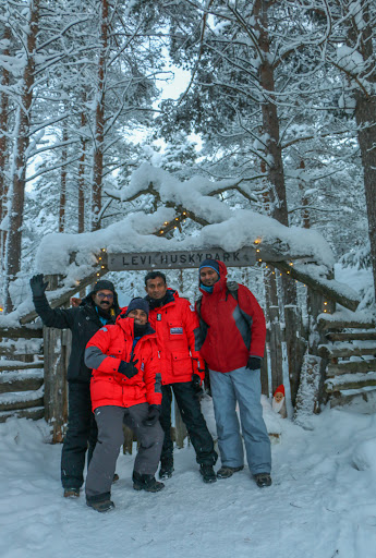 Amidst throngs of icy pine trees and frozen brooks, we reached Levi Husky Park. Even though many destinations are offering husky safaris on Lapland, I specially picked out this one as the ambience here exactly resembles what I have dreamt of. Also, when 3-4 huskies pull the sledge in all other places, around 10 huskies are allotted for each sledge here. The tour was booked beforehand from Levi Information Center. It is 60 EUR per head for every 2 km. We were about 10 minutes late when we reached the spot. By then, a tour before the safari had already begun. It was a group of 20 including children. To welcome all the visitors, a cute Pomeranian dog accompanied the guide constantly wagging its tail.
