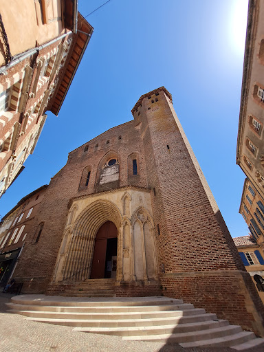 L'édifice à nef unique comporte quatre travées greffées sur un sanctuaire roman, modifié au 18e siècle. En raison de son plan (nef unique avec chapelles latérales prises dans d'épais contreforts), cet édifice appartient au premier âge du gothique méridional. L'ensemble de l'édifice conserve des permanences romanes : fenêtres à plein cintre, modillons sculptés à têtes grimaçantes, chapiteaux à têtes sculptées au niveau de la première travée intérieure. Tous les murs sont en briques. Seul le portail ouest est en...
