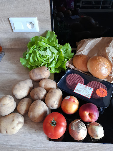 Tomate, salade, pain burger (du vrai pain), steak (250g 5% matière grasse), oignon, nectarine, pomme de terre POUR UN TOTAL DE: 8€ !