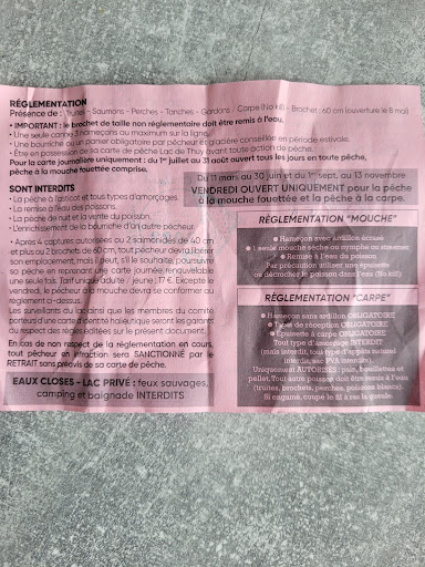 Très joli lac et très bel endroit uniquement pour les promeneurs . Pour ce qui est question de la pêche 🤦♂️🤦♂️🤦♂️ les prix sont assez chère même très chère je dirai pour des règles de pêche incompréhensible. Pas le droit à ceci ou à cela patati patata. A quel moment pour pêcher la carpe on ne peut pas amorcer du tous ou pêche au maïs ? ??? Bref 1 fois se sera pas 2 croyez moi même faire de la route en plus sa ira très bien ... qui a fixé les règles je ne sait pas mais il devait avoir un grain à ce moment là. Bref très mauvaise expérience en tant que pêcheur suffit juste de lire les règles sur mes photos. A...