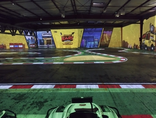 Lieu hybride très sympa qui propose boissons et salles de quizz, et évidemment le karting. Le concept est évidemment un régal, ça détonne complètement avec le karting classique, et c'est à essayer au plus vite. On prend l'objet en main très rapidement, qu'on soit familier avec la conduite ou pas. Je craignais de ne pas voir grand chose, mais la piste est très lumineuse et bien définie, ça marche bien. les commandes répondent bien, les passages sur bonus et les limites de la piste sont relativement précis. En fonction du jeu choisi, les parties gagneraient à être en majorité rallongée, surtout si on compte le temps d'installation..