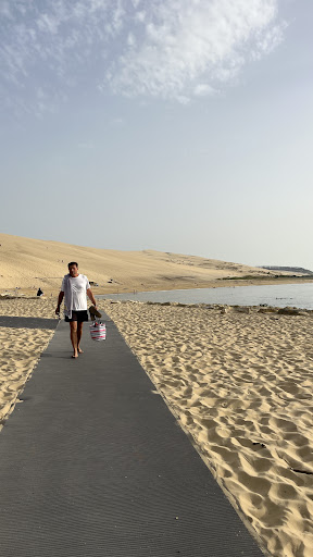 Ein schicker Strand am Fuße der großen Düne. Zum Baden geeignet. Erreichbar ist der Strand am einfachsten, wenn man am Kreisverkehr vor dem großen Parkplatz sich rechts hält und dann versucht so dicht wie es geht durch die Wohnsiedlung wieder zurück an die Düne zu fahren. Da wir in der Nebensaison im September dort waren und dann noch mitten in der Woche sind Parkplätze kein Problem gewesen. Je mehr Saison, dass du weiter der Fußweg. Wir hatten bloß 100 m zu gehen. Dann geht eine Treppe hinunter und man kann am Wasser Richtung Düne gehen. Dann spart man sich den weiten Weg...
