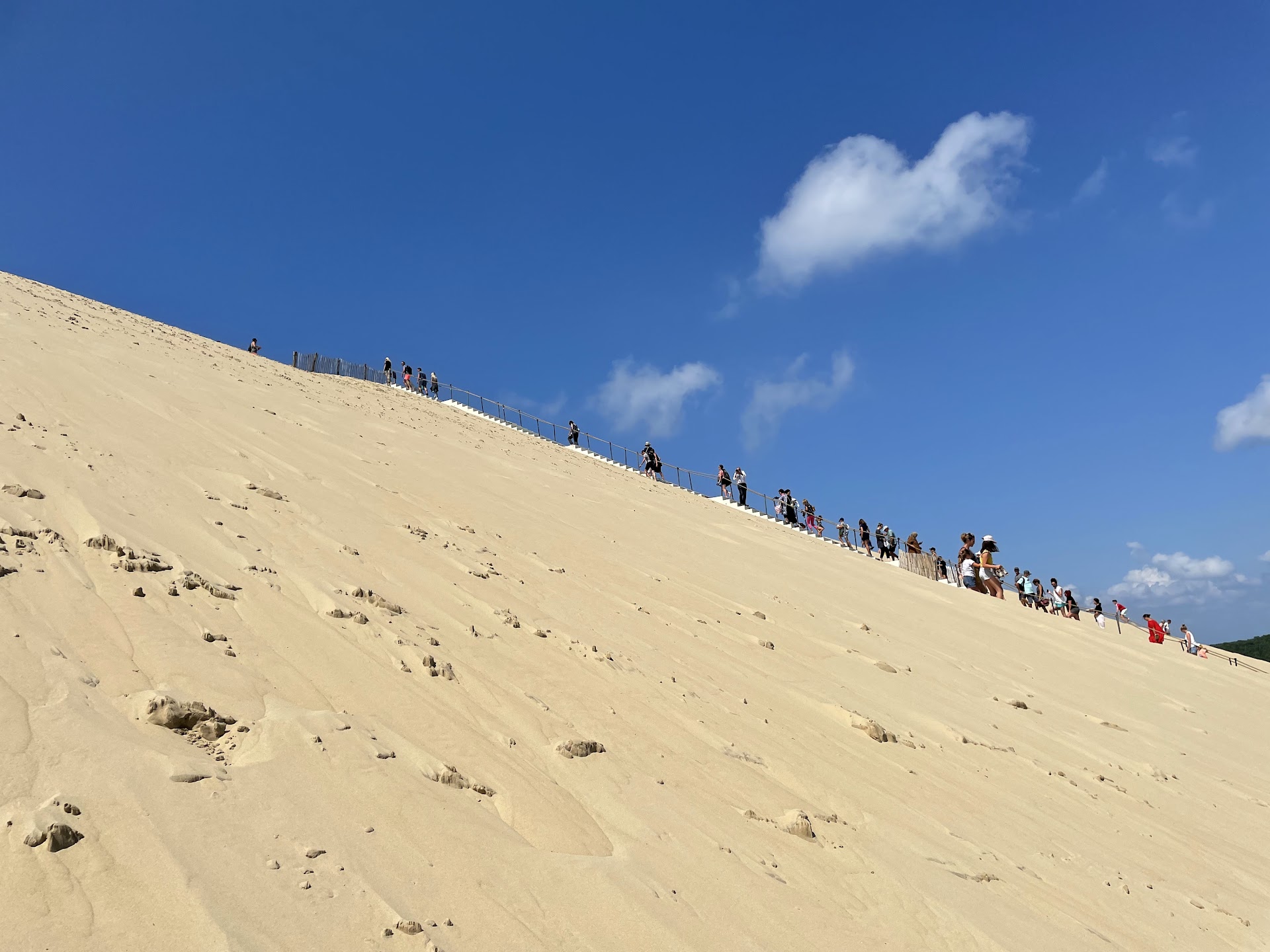 We visited Arcachon for a day, during our holidays in Bordeaux. We got there by train, so our whole experience was without a car. We took the bus from the city centre to the Dune of Pilat. The ride was approximately 45 minutes through the residential areas of Arcachon. The bus stop is right next to the parking area of the Dune. From there you can walk straight to the Dune, passing by the small shops and snack bars. We were lucky as the temperature was quite comfortable during our visit. It takes around 20 minutes to get to the dune and the last part is the hardest. After a short walk on the fine sand, you reach the stairs with around 150 steps to get to the top of the dune. And when we were there, it was packed with people so getting up there took some time. Definitely worth the effort and the time to get to the top though. Once in a lifetime experience. The views are amazing and the scenery is outstanding. We visited the dune with our two children and everything was OK. You can get some rest, cool down and have a quick lunch, refreshment or snacks when you get back to the entrance area. The bus to the city centre comes every hour so keep an eye on the timetables so that you don't waste any time waiting. The number 3 bus goes through the residential areas and the busy beaches. You get the chance to get off at Moulleau for example. Overall a great experience. Great photos and definitely a cool memory...