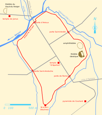 La Porte Saint-André è un raro esempio di porta romana a due piani: • al piano inferiore, due archi centrali per i carri e due più piccoli per i pedoni; • al piano superiore, logge con colonne corinzie, che davano eleganza all’insieme e forse ospitavano statue o iscrizioni celebrative.