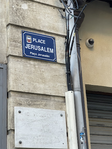 Sign outside reads: The sign reads…. City History - Synagogue The former Jewish quarter was located northwest of the current Place du Palais. In 1221, the Jewish community was relocated to the parish of Saint-Pierre, around what is now Place Jérusalem. This “carrière,” a term given to Jewish quarters in the Comtat Venaissin region, was closed off by three gates, of which only the Calandre gate remains. The inhabitants enjoyed the protection of the Pope. After the Revolution abolished these quarters, most of the houses were destroyed in the 19th century. The synagogue, known as the “escole,” included the temple and rooms necessary for community life: meetings, marriages, butcher shop, bakery, etc. Rebuilt between 1765 and 1767 by Franque and lavishly decorated, it was completely destroyed by fire in 1845. It was immediately reconstructed by the municipality under the plans of the architect J.-A. Jeoffroy, who, unexpectedly, designed a neoclassical rotunda covered with a dome inside.