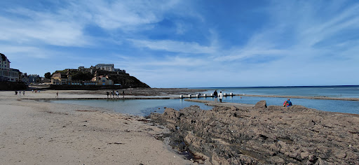 Nous adorons cette plage qui nous offre à chaques marée haute ou basse une expérience unique ; Quand il fait beau la plage et les bâtiments offrent un spectacle de couleurs aquatique époustouflant propice aux belles photos ou à l'inspiration picturale.... j' ai une préférence à marée basse le matin....Par contre quand il fait pas beau les photos ou les promenade sont toujours inéressantes mais le centre ville et ses commerces sont à proximité immédiate pour se réfugier en cas de trop mauvais temps. . Vous pourrez manger ou prendre une consommation dans un des restaurant, snack de l'esplanade et vous installer face au couchant...un must . La plage est équipée d'une piscine submersible qui permet la baignade à marée basse et d' un plongeoir praticable à marée haute. La plage est surveillée par des sauveteurs qui ont leur QG au millieux de la digue où vous pourrez trouver des douches, wc et informations météo.