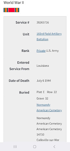 Levy Blanchard was a young man with his family from Church Point, La. My friend Paul said his great uncle died as he was buried at Normandy. Paul sent his unit: 183rd FA. That... was all the information I had. I started with 183rd. 183rd FA BN was from Idaho and predates the 183rd formed in 1946 from Colorado. First issue: How does a kid from rural Louisiana end up in the Idaho Unit? Answer: 3rd Amored Division was formed at Fort Polk or Camp Polk. 3rd Armor (General Blood and Guts) (as with many divisions)... was rounded out by National Gaurd Units. So, he joined here in Louisiana and was assigned to this unit. 3rd Amored Division landed on the 28th of June. For the record, Normandy was still active as a campaign till August 44. His date of death was listed as 6 July 1944. Further records search for those sons and daughters who gave their life in WW2 actually reflects DOW 6 July 1944. So, the next question was where the 183rd FA was in Normandy Invasion; nothing came up. I moved to 3rd Armored Division on 6 July; it was the Battle of St. Lo. Some where's between 3 to 6th of July as the initial battle or early skirmishes before the battle....or the actual start of battle, Levy was badly wounded. It's not beyond the pale to think that the (then) extensive medical support was still coming off the sea, but the combat units pushed forward to create the break-out Omar Bradley was pushing for. Perhaps he was tagged expectant and hopefully made comfortable. Ms. Suzanne (?) met us inside and presented his certificate. She took us directly to his marker with a small covered golf cart. The dirt was from the area of Omaha Beach, which was smeared in the name of Levy to highlight his name. I sat through the remainder of the tour through France doing what any soldier who's been in combat does...you just try to imagine every emotion, thoughts, fear, what would I have done, all these questions ruminating inside through the entire trip. The family will have the flags presented to his family and a picture hand drawn by a...