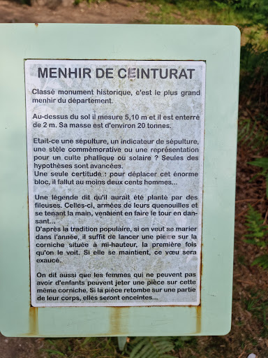 This solitary menhir is about 5 meter tall and weighs an estimated 20 tons. It is located along a small path off a turn in the road from D9 to Ceinturat. It is about a 10 minute walk from the turn where you can park. The menhir is located in a quiet place and has an information...
