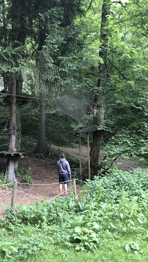 We only went to the tree park. Me (15) and my 2 younger sisters (11 and 10). The youngest was only allowed to the green and blue trails, while me and the middle one were allowed everywhere. It was my birthday and surprisingly I didn't have to pay! My sisters were quite expensive (20 and 30 €). The green and blue trails were fine except for the slooooow families that waited for aaaall their members before moving on to the next platform, but this has nothing to do with the park itself. The red trail was amazing, especially the long zipline over the lake!