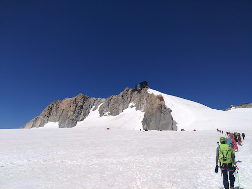 Ci sono stato il 13 e 14 luglio 2018 . Partiamo dal presupposto che il rifugio, specialmente se si parte da punta Helbronner, si trova alla fine di un'escursione al cospetto delle più importanti e famose cime della zona teatro di epiche imprese alpinistiche del passato.... Dente del gigante, capucin, monte Bianco ecc ecc, quindi sulla posizione non c'è niente da dire, semplicemente il top. Si può anche raggiungere in breve tempo dalla funivia dell'Aguille du midí il cui arrivo è appena sopra. L'accoglienza al rifugio è un po' complicata ma per quello che mi riguarda cordiale. All'ingresso c'è una zona deposito scarponi con Delle rastrelliere a cui appenderli e Delle cassette dove depositare altri materiali, la zona è riscaldata quindi c'è anche possibilità di far asciugare vestiti anche se non è consentito appenderli. La sala da pranzo è accogliente, le camere un po' sacrificate ma penso sia normale per una struttura a questa quota. La parte peggiore sono i bagni, 3 orinatoi e 3 normali con un lavabo microscopico e, quantomeno io, non ho capito se c'è eventualmente possibilità di una doccia o meno. Diciamo che dato l'affollamento sono abbastanza i bagni sono scarsi, mediamente sporchi (ma questo sta anche all'educazione Delle persone) e puzzolenti. Verificare la presenza di carta igienica prima di entrare perché con tutta la gente che ci passa potrebbe essere finita e giustamente i gestori non possono sempre essere lì a sostituirla calcolando che arriva gente a qualunque orario del giorno quindi devono anche preparare da mangiare mediamente lungo tutto l'arco della giornata. La nostra stanza, all'ultimo piano, purtroppo era sopra i bagni e lasciando la finestra aperta (essendo dentro in 26 è utile) spesso arrivava olezzo da sotto. Il rifugio è un rifugio privato quindi non risultano convenzioni con CAI o affini anche stranieri, il costo della mezza pensione è di 55€, il cibo non è particolarmente buono ma nemmeno scadente e le porzioni non sono scarse, il servizio abbastanza spartano. Una bottiglia di acqua da 1,5 lt costa 6€ una lattina di birra da mezzo litro 8€. Se mangiate al di fuori della mezza pensione 7€ omelette normale 10€ omelette de montagne 7,5€ sandwich 7€ torta 3€ the Non ricordo pasta e altro 3 stelle perché per essere un rifugio privato in questa posizione ci si...