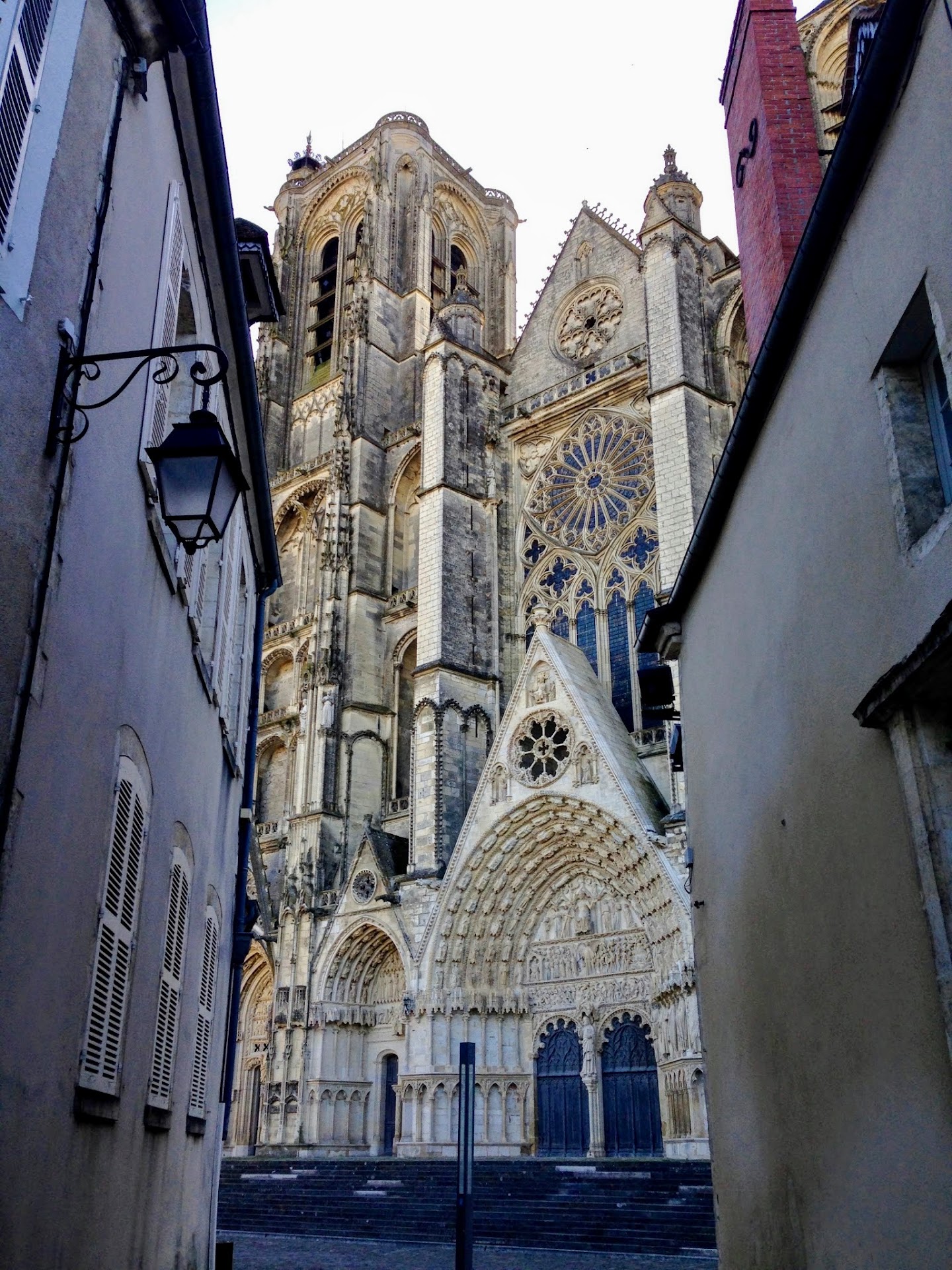 Bourges Cathedral is a sublime example of the early gothic architecture of France dating in the early years of the 13th century (around 1215) and dates from the same time as its more famous sibling, the cathedral at Chartres. It has a very elegant and simple plan of the double-aisled basilica but without transepts so the eye moves quickly to take in the whole of the plan without interruption--it is a satisfying experience. As with Chartres, the windows at Bourges are famous for their rich and luminous colors, especially the blues, and unlike most cathedrals in Europe, it retains the complete set of 13th c. windows, which is pretty rare. The exterior reflects the plan of the church very cleanly and beautifully. A real gem; come on a sunny day to really enjoy...