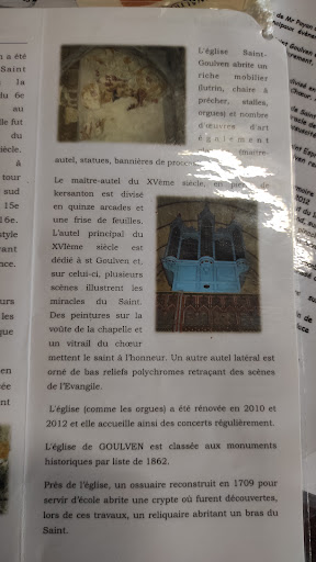 Read moreL'église Saint Goulven est classée monument historique ainsi que son cimetière qui entoure l'église. Elle se remarque de loin avec son clocher et sa flèche sculptée. A l'entrée douze statues des apôtres sont intéressantes. Le bois est très présent : un magnifique orgue de tribune, de belles sculptures, une chaire à prêcher travaillée avec des anges, un vitrail de la vie de Saint Goulven en font une église incontournable. Le joli jardin du souvenir charmant et paisible est à découvrir...