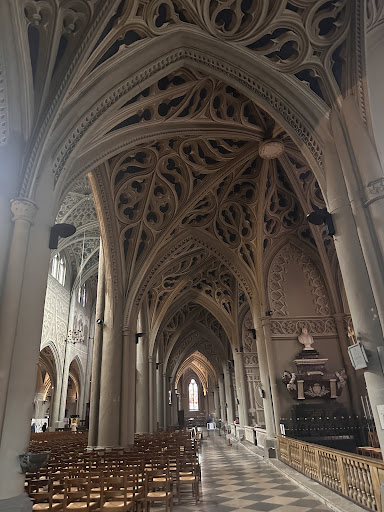Read moreIn una bella giornata di sole appena primaverile, seguendo le indicazioni verso la cattedrale, siamo giunti in una piazzetta relativamente piccola e, a parte un locale tipo pub che si stava preparando per la serata di festa per san Patrizio, silenziosa e appartata. Una facciata quasi anonima e poco appariscente. Una porta che riprende la figura del battente del portale, ci fa accedere in un piccolo atrio buio che si illumina al passaggio di qualcuno. Siamo entrati nel tempio con un ampio respiro, pieno di luce e di... stupore, nel vedere con meraviglia uno spettacolo quasi unico. Il trompe l'oeil bianco e nero copre quasi la totalità dei muri, crea un effetto straordinario. Seduti sull'ultima panca, leggendo due mini guide fotocopiate in italiano (davvero se ne trovano poche nella nostra lingua!!!), abbiamo gustato lo splendido lavoro eseguito nei secoli. Il sole di mezzogiorno illuminava decisamente le belle vetrate. Sul lato destro, a metà navata, un tavolo con diverse pubblicazioni e una persona che accoglie i turisti e i pellegrini in preghiera per informazioni...