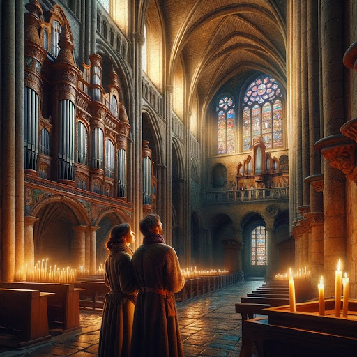 En me déplaçant doucement, j'admire l'orgue de Louis Bonn, un chef-d'œuvre situé au revers de la façade ouest. Sa présence majestueuse ajoute une dimension historique et artistique à l'atmosphère. Catherine et moi échangeons des regards et des chuchotements, impressionnés par la beauté de l'instrument et le sens de continuité qu'il apporte à ce lieu sacré.