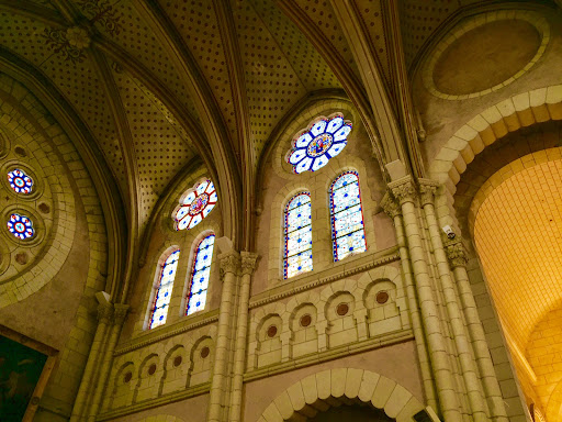 Lorsque Catherine et moi entrons dans l'église Saint-Jean-Baptiste de Langeais, un calme immédiat nous enveloppe. La lumière tamisée des bougies jette des reflets sur les vitraux, créant un jeu de couleurs sur les vieilles pierres. L'église, fondée au IVe siècle par Saint Martin, dévoile une histoire riche à travers ses murs.