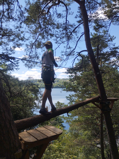 Ce n'était pas prévu, dernière journée de vacances, et nous voilà à nous laisser tenter par un acrobranche ! Un vrai moment de plaisir ! Des parcours de toutes sortes, variés et pour tout les niveaux. On monte en difficulté gentiment et c'est très appréciable (à partir du parcours 6 pour nous, 10, 12 et 16 ans, les parcours 1 à 4 sont super pour les plus petits dés 3 ans), pour finir en beauté pour les plus sportifs sur le parcours 14, ou pour les plus téméraire avec le saut dans le vide du parcours 13. Parcours 10, tyroliennes à gogo avec vu en prime sur le lac magnifique ! Habitués aux accrobranches partout où lon va en vacances, c'est de loin le meilleur que l'on ai fait. (Ca donne envie de revenir l'an prochain ^^)