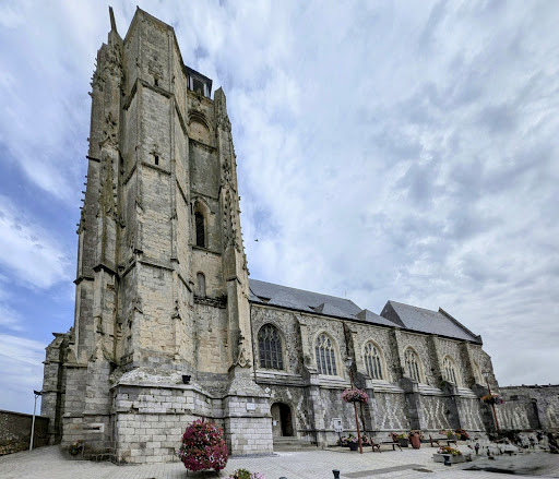Perchée sur les hauteurs du Tréport, cette imposante église gothique domine la ville et le port. Outre ses dimensions impressionnantes, l'église attire l'attention par sa façade en damier. Son rôle dans le pèlerinage de Saint-Jacques-de-Compostelle est évoqué par les motifs de coquilles Saint-Jacques sculptées sur le portail de l'église. Port maritime, Le Tréport servait de point d'entrée aux pèlerins d'Angleterre et d'Europe du Nord vers l'Espagne. À l'intérieur, on remarque les clés de voûte, l'immense tableau accroché entre la nef et le chœur, les vitraux aux couleurs vives et contrastées ainsi que des statues anciennes. Une statue de sainte Thérèse arbore l'écharpe tricolore du maire, symbolisant une prière pour la paix en Ukraine. L'église Saint-Jacques est un très bel édifice classé...
