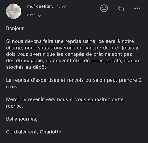Je pensais ĂȘtre venue acheter un canapĂ© dans un magasin oĂč, comme beaucoup dâautres, jâallais ĂȘtre pressĂ©e pour finalement ĂȘtre déçue. Seulement, jâai Ă©tĂ© trĂšs bien reçue par Marine qui mâa accompagnĂ© avec beaucoup de bienveillance. Je nâai que peu rencontrĂ© de commerciale comme elle qui, au delĂ du chiffre et des primes, a accueilli et prit en considĂ©ration mes envies et mes besoins avec tant de bienveillance. Ici vous ne rencontrerez pas des vendeurs, mais des professionnels qui croient sincĂšrement en la qualitĂ© de leurs produits, et qui, en plus dâen ĂȘtre persuadĂ©s, vous apportent des Ă©lĂ©ments pertinents et avĂ©rĂ©s qui mâont convaincu moi aussi. Jamais je ne me suis sentie poussĂ©e Ă lâachat. On mâa laissĂ© le temps de me projeter et de rĂ©flĂ©chir. Et malgrĂ© la petite scĂšne de mĂ©nage de mon conjoint, Ă aucun moment je ne me suis sentie jugĂ©e ou dĂ©nigrĂ©e par lâĂ©quipe Mobilier de France. Si vous cherchez du mobilier de grande qualitĂ©, avec des solutions de payements adaptĂ©s Ă chacun et surtout, surtout, Ă avoir lâimpression dâĂȘtre autre chose quâun pigeon Ă dĂ©pouiller, rendez vous dans ce magasin.