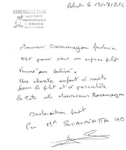 Après avoir réglé l’entrée pour ma fille, le personnel de l’accueil du parc nous a invité à suivre un jalonnement de panneaux pour nous rendre sur la zone où ma fille devait être équipée . Nous avons été amenés avec d’autres personnes à passer sous une installation située à 2m de hauteur environ (voir photos). Cette installation consistait en une cage formée de filets à l’intérieur de laquelle sautaient des enfants. C’est à ce moment que j’ai été percuté au niveau de la tête par un enfant (à priori d’une dizaine d’année) qui m’a sauté à pied joint sur le front. Plusieurs témoins ont vu la scène et j'ai aujourd'hui leur témoignage écrit. Vu la violence du coup, les témoignages ont décrit mon état comme désorienté pendant 3 à 4 minutes mais je n’en ai pas souvenir. Aucun employé n’est venu s’enquérir de mon état de santé pendant ce laps de temps ! j’ai dû moi-même aller à l’accueil ou un employé m’a seulement donné un pansement et de quoi me désinfecter. J’ai dû horriblement batailler pour obtenir une déclaration de la part d' un responsable d’ADRENALINE PARC (voir en PJ) dans laquelle il reconnait que la zone sous le filet n’était pas balisée (ex : rubalise, panneau de danger…). Il admet ainsi de fait que le passage dessous n’y était pas proscrit et par conséquent reconnait implicitement la responsabilité de la société ADRENALINE PARC.