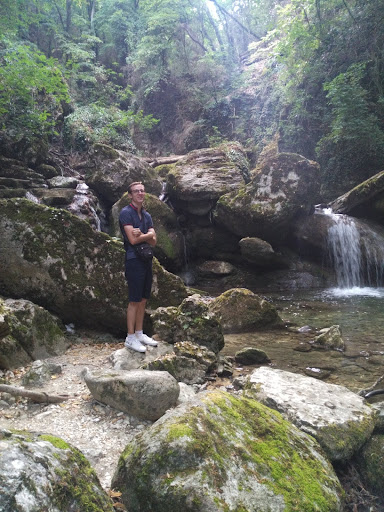 It takes about 20 minutes to walk the 600 meter trail that rises about 100 meters. The footing is rocky with loose rocks. Near the kiosk just below the cave entrance there are small trails that access the creek which comes out of the cave. Each time we have been out we have seen people swimming or wading in the creek.