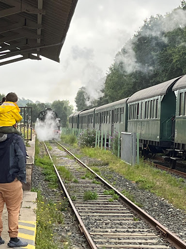 Si vous prenez la vapeur trieux un jour de marché, venez suffisament en avance pour avoir le temps de vous garer. Pour 6 (3 enfants et 3 adultes) nous avons payé 85e en réservant par téléphone pour le lendemain. A part nous avoir prévenu qu'il y avait 15 minutes de marche entre la gare de pontrieux et le centre ville, Nous n'avons pas eu d'autres informations. Nous sommes donc montés à bord de ce beau train. Les informations fournies lors du trajet sont bien audibles mais peu fournies et il n'y a pas tant de choses à voir à l'exterieur. Assayez-vous plutôt coté quai au départ à défaut vous ne verrez que des arbres et des fougères. Une alte de 30 minutes environ à la maison de l'estuaire vous permettra de voir des graines d'Amérique du Sud ainsi que des portraits de chouettes et d'écureuils ainsi que quelques plans vue du ciel de la régions. On nous balance rapidement, sans aucune précision pour ceux qui n'y connaissent rien que cette maison est également en lien avec l'affaire Quémeneur. Vous assisterez également à une micro pièces de théâtre en plein air qui n'est malheureusement pas en lien avec la région. Pour un départ à 11h, nous sommes arrivés à Pontrieux à 12h25. Attention il faut prévoir un supplément de 5e par adulte si vous souhaitez une navette, qu'il faut réserver à l'avance. Le train n'était pas complet comme la veille pourtant TOUS les restaurants ouverts étés complets nous nous sommes rabattus sur un snacking sur la place principale où il resté miraculeusement de la place. D'autres voyageurs ne savait toujours pas où manger. La seule boulangerie du centre étant en liquidation et la boucherie fermant à 13h00 un vendredi.... à Pontrieux vous pourrez faire de la barque pour 4e par adulte et 2e par enfants. Oubliez la visite du château de la Roche Jagu que vous voyez sur leur site vous ne pourrez voir que les jardins au vue des horaires. Bref mieux vaut aller voir Pontrieux et la Roche jagu en voiture ça revient moins cher et pour le train....un photo depuis les...