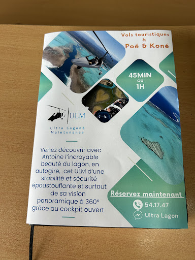 Read moreNous avons choisi le vol en duo d'une heure en gyropthère. Sensation de liberté, vous volez au contact des éléments. La vue est magique , le lagon est magnifique. Lors de notre vol en patrouille (2 gyroptères volant ensembe) nous avons volé entre 500 et 1500 pieds ce qui permet de bien voir les fonds marin et leurs habitants . Nous avons vu des tortues par dizaines, des requins, dont un requin marteau, des duguongs, des raies mantas et autres. Un énorme trou bleu sur la barrière est déclaré tabou. La mangrove est très étendue , nous avons pu admirer le cœur de Voh. Mon épouse a vaincu sans difficultés son appréhension, à la vue de ce spectacle et avec l'aide et la gentillesse de Jean Yves le chef pilote. SURTOUT NE PAS HÉSITER , même si le prix est élevé cela VAUT...