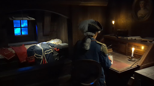 The walk-through (not a timed show, so no waiting unless busy) takes you through his study, the dockside where provisions were bought and loaded and then through the lower decks of his ship, crammed with provisions. As you move on, the voyage gets underway and the ship begins to fill with the exotic flora and fauna he was collecting on his way. Before long the ship begins roll in heavy seas. Luckily for us, the effect is re-created with much stormy weather and spray, by having the hull pitch and toss around us while the floor stays still. Live actors (I understand they double up as soldiers in the Amoureux de Verdun immersive) supplement the mannequins & animatronics as officers and crew.