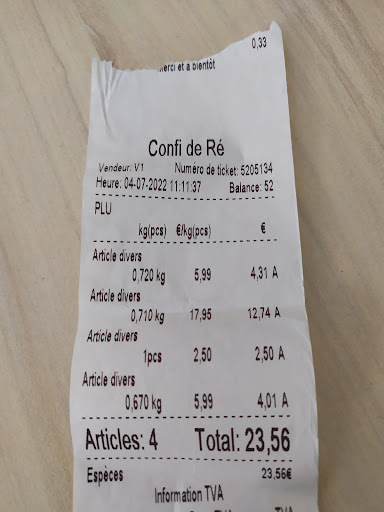 Read moreMaraicher CONFI DE RE : 0 étoile 😠 Très mauvaise expérience avec ce maraîchers. 1- Prix des figues annoncé (car bien évidemment pas de prix affiché, ce qui est totalement illégal🤔) par le vendeur 7 euros le kg , facturé 17/kg. Certains pourraient se dire que j'ai mal entendu, alors mon mari aussi a des problèmes d'audition... 2- Je demande 8 figues, il m'en met 12. Au prix du kg, c'est bien rentable pour lui mais très malhonnête. Un client de perdu, mais j'imagine que c'est pas grave puisque je ne suis que de passage .... Et Il y aura bien d'autres clients à arnaquer.