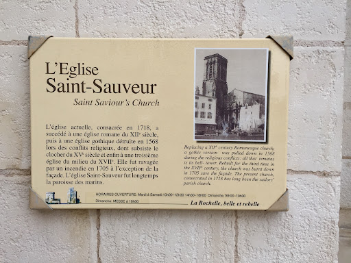 Read moreVenant d'être magnifiquement rénovée, l'église Saint Sauveur,un des édifices emblématiques du patrimoine religieux de La Rochelle,mérite la visite de celui-ci. Elle fut construite au 12ème siècle par les moines de l'île d'Aix.En 1419,elle fut ravagée par un incendie,puis reconstruite.En 1568, l'église Saint Sauveur fut à nouveau détruite par les protestants rochelais.Une troisième église Saint Sauveur fut achevée en 1669.Le portail est le seul vestige de l'incendie qui dévasta l'église en 1705.L'église actuelle,la quatrième église Saint Sauveur,date de 1718. Après une longue période de restauration, elle rouvrira en décembre 2008. Ouverte du mardi au samedi de 10h à 12h30 et de 14h30 à 18h, le dimanche de 16h à 19h15. Expositions temporaires régulières. Messe le...