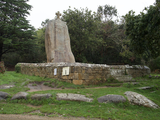 Magnifique menhir sculpté. Le monument mégalithique est christianisé en 1674 lors d’une Mission de « l'apôtre de la Bretagne », le père jésuite Julien Maunoir qui le fait insérer dans un enclos ayant un accès par échalier, le fait peindre, sculpter et surmonter d'une croix. La christianisation des « pierres dressées » témoigne d'une volonté d'assimilation des signes religieux antérieurs. Le menhir fait l’objet d’un classement au titre des monuments historiques depuis 1889 sous le nom de Menhir de Saint-Duzec (appellation erronée qui fait référence au moine Duzec qui fonde au VIe siècle un petit monastère sur un territoire très limité allant de la chapelle Saint-Uzec au menhir). Le décor était polychrome, comme l'attestent des cartes postales du début de XXe siècle ainsi qu'une planche en couleur...