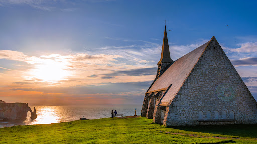 Die kleine Kapelle thront auf der Falaise d’Amont, einer der beiden berühmten Felsklippen von Étretat. Von unten wirkt sie beinahe wie eine stille Wächterin, die über das Meer und das Städtchen wacht. Ursprünglich wurde die Kapelle im 19. Jahrhundert (1856) von Fischern erbaut und der Heiligen Maria, Schutzpatronin der Seefahrer, gewidmet. Sie war ein Ort des Gebets und der Hoffnung für die Männer, die täglich hinaus aufs oft stürmische Meer fuhren — und für ihre Familien, die an Land blieben und bangten.